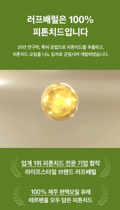 1. 제주 편백오일 농축 피톤치드 함유(20,000ppm)_본문 키워드: 필로우미스트 / 멜라토닌 2. 특허 공법 적용한 20년 경력 제조사의 노하우_본문 키워드: 편백수 / 아로마테라피 - 피톤치드 전문 제조사의 20년간의 노하우와 특허 공법을 통해 안정성과 효과를 동시에 확보하였습니다. 3. 무알코올 & 무계면활성제 포뮬러_본문 키워드: 룸스프레이 - 알코올이나 계면활성제를 포함하지 않아 피부 자극이나 호흡기 부담 없이 사용할 수 있습니다. |